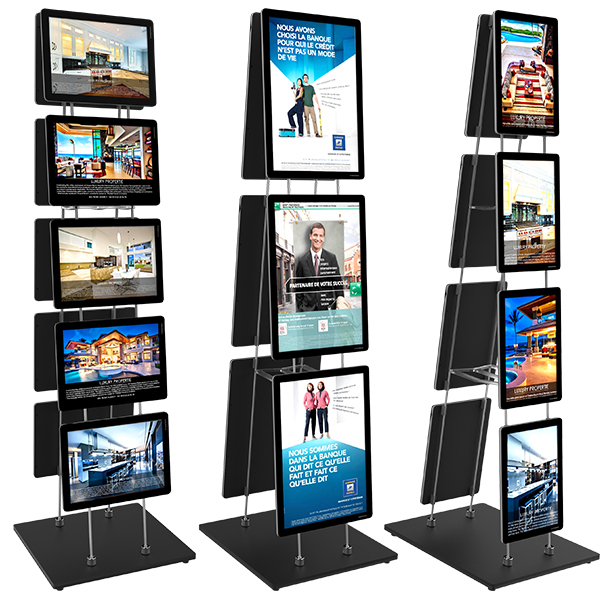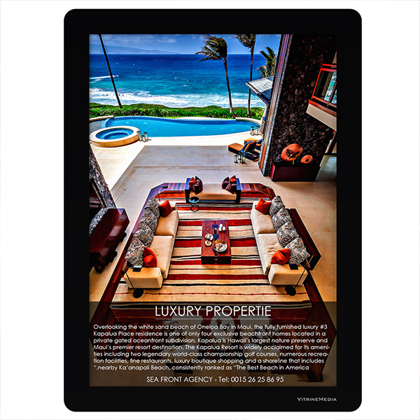 Zusammen mit der VM Wall lässt sich dieses einseitig leuchtende Display an Wänden montieren oder für Immobilienauslagen nutzen. Auch die Standmodelle VM Box und VM Mobile Stand Easy Clip lassen sich mit dem Display ausstatten.